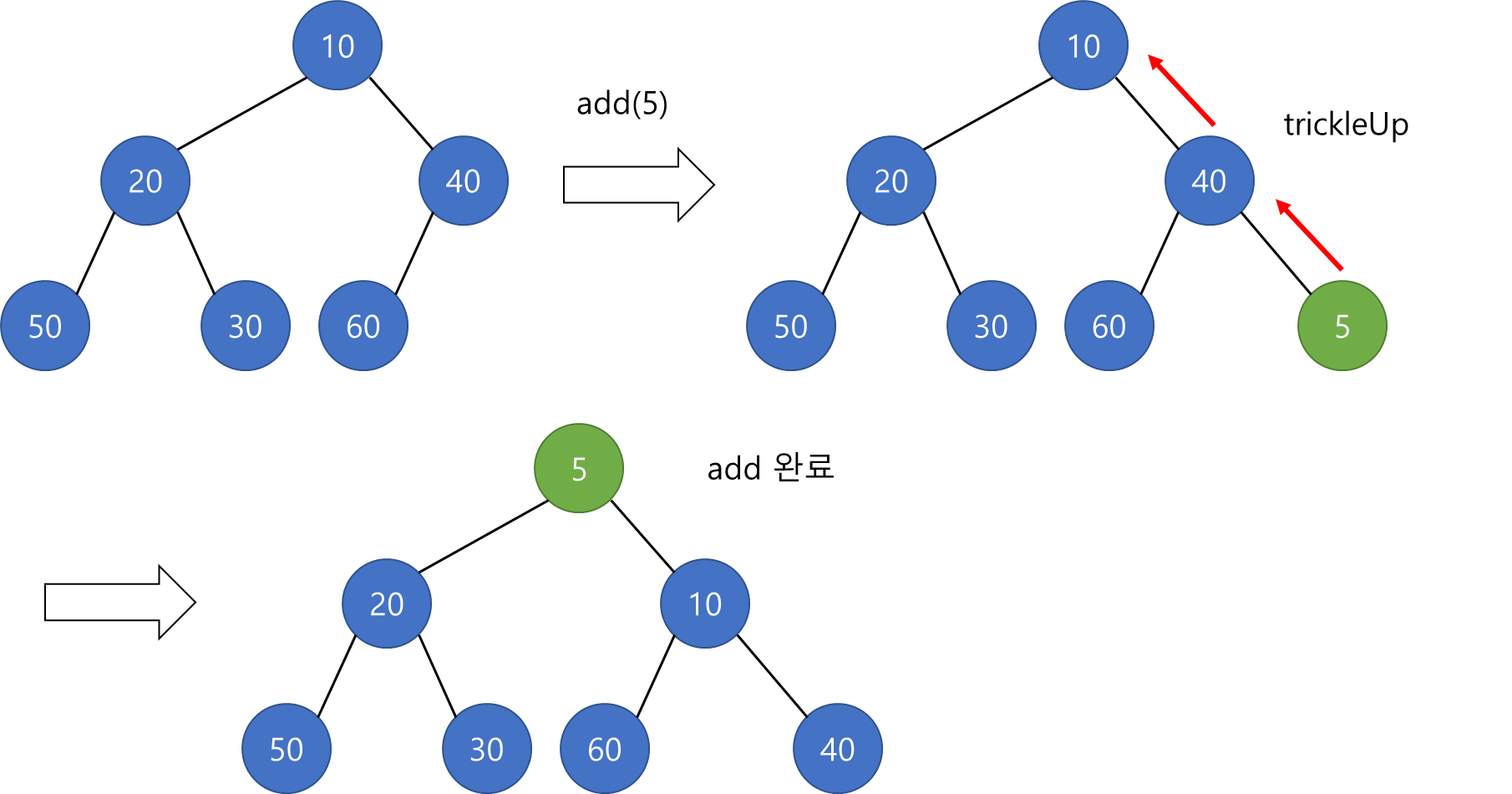- 부모 노드와 비교함, 부모 노드보다 작다면 두 노드를 교환함 (trickleUp)
