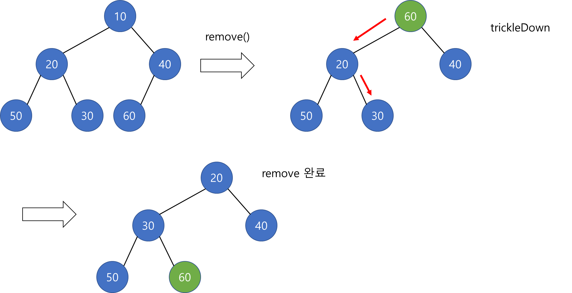 - 루트에서 시작하여 두 자식 중 작은 노드와 바꿔주어 힙의 규칙을 만족하게 해줍니다. (trickleDown)