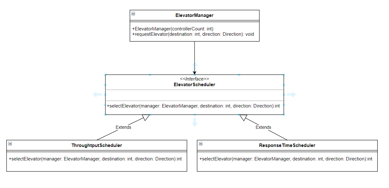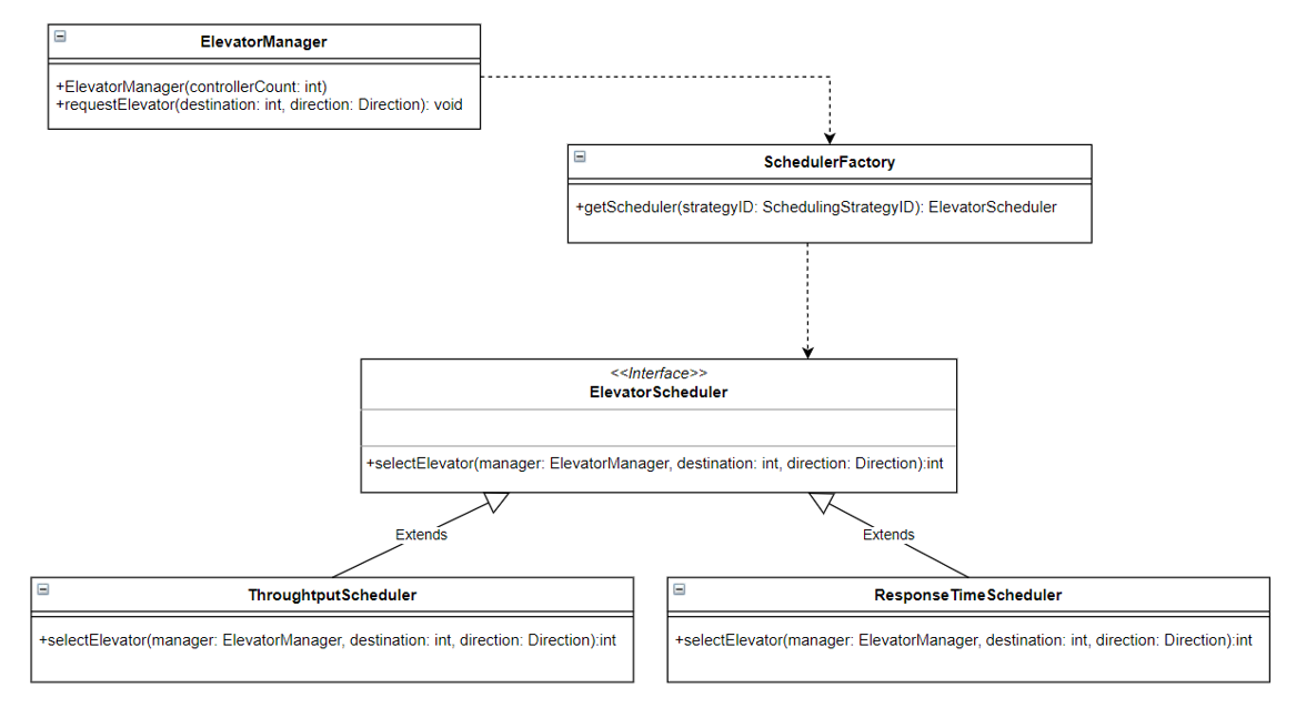 처리량 최대화 전략이나 대기 시간 최소화 전략이나 모두 ElevatorManager 클래스의 입장에서는 엘리베이터 스케줄링 전략의 일종이다. 그러므로 ElevatorManager 클래스는 ThroughputScheduler 객체와 ResponseTimeScheduler 객체를 생성한 후, 이를 각각의 클래스가 아니라 ElevatorScheduler라는 인터페이스를 통해 사용할 수 있다.