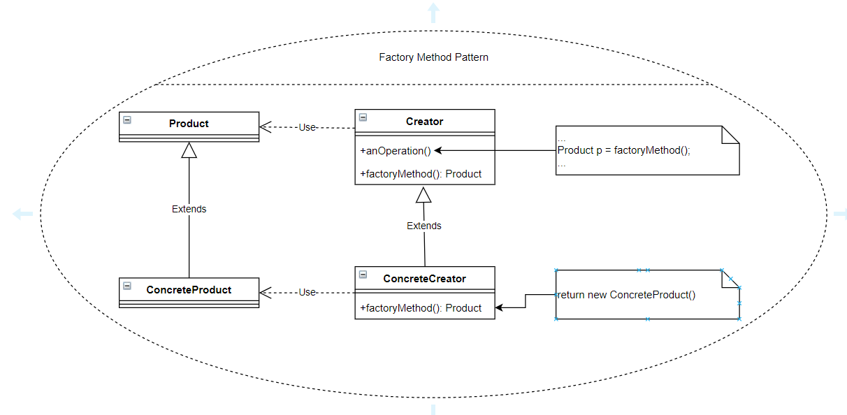 - ConcreteCreator : 팩토리 메서드를 구현하는 클래스로 ConcreteProduct 객체를 생성한다.