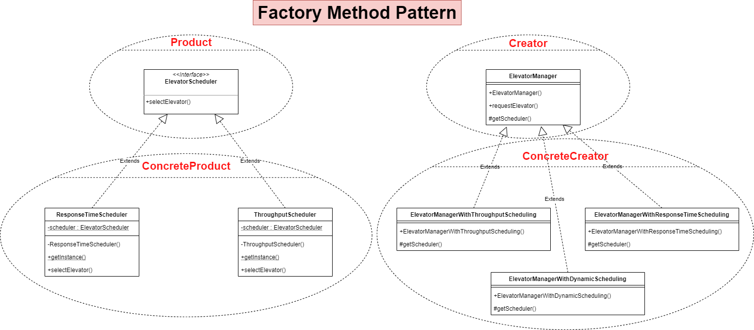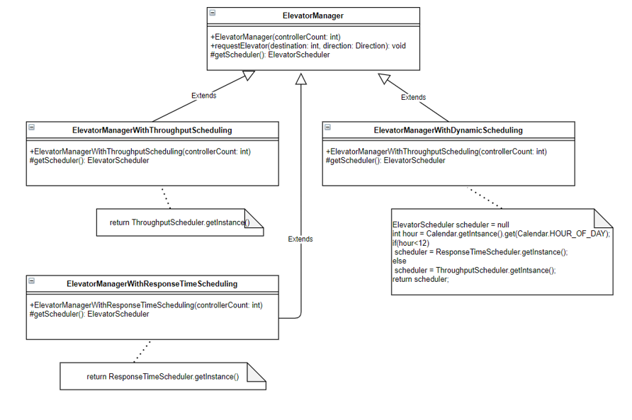 - ElevatorManagerWithThroughputScheduling, ElevatorManagerWithResponseTimeScheduling, ElevatorManagerWithDynamicScheduling : ConcreteCreator
