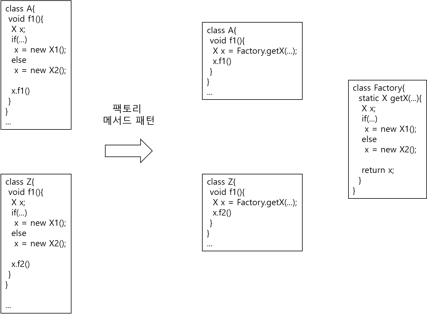 위 그림의 왼쪽처럼 여러 개의 클래스(클래스 A, 클래스 Z 등)에서 필요에 따라 클래스 X1의 객체와 클래스 X2의 객체를 생성해 사용한다. 만약 X1과 X2를 생성하는 방식이 달라지거나 X3와 같이 새로운 클래스의 객체를 생성해야 하는 경우에는 X1과 X2를 생성하는 모든 코드 부분을 변경해야 한다.