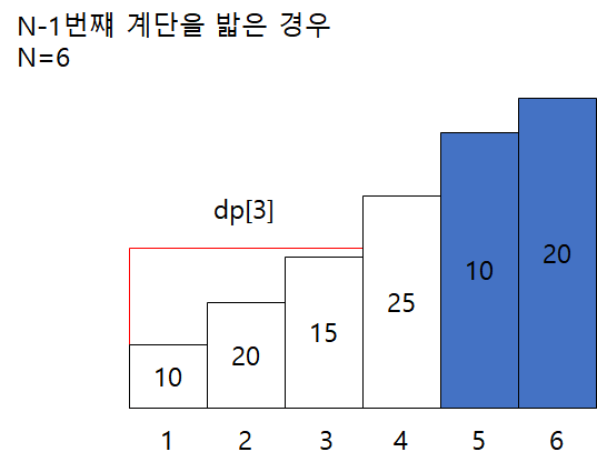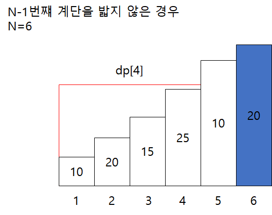 따라서 N=6인 계단인 위의 그림에서 5번째 계단을 밟아서 나올 수 있는 값은 dp[6] = dp[3] + arr[5] + arr[6] = 35 + 10 + 20 = 65입니다. 정리하면 N-1번째 계단을 밟은 경우 6번째 계단을 밟았을때 나오는 누적합은 65입니다.
