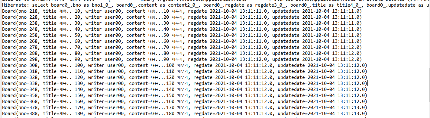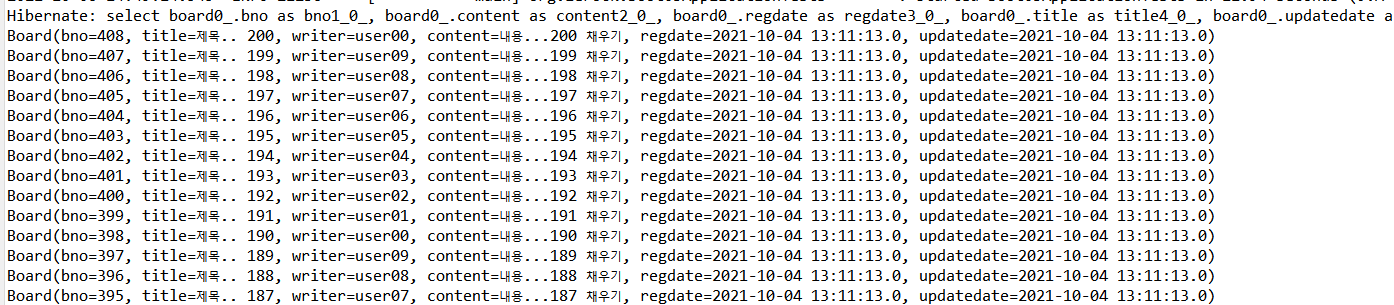 Board(bno=385, title=제목.. 177, writer=user07, content=내용...177 채우기, regdate=2021-10-04 13:11:13.0, updatedate=2021-10-04 13:11:13.0)