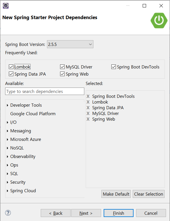 본 글은 스타트 스프링 부트 도서의 내용을 복습하기 위해 작성된 글입니다. 0. SpringBoot 프로젝트 생성 File->New->Spring Starter Project Lombok, Spring Data JPA, MySQL Driver 라이브러리 선택 1. 프로..