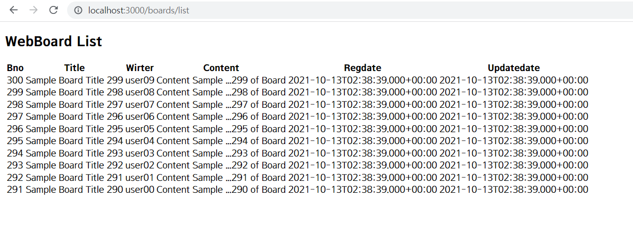 브라우저에서 http://localhost:3000/boards/list 접속하여 게시판의 게시물이 잘 나오는지 결과를 학인합니다.