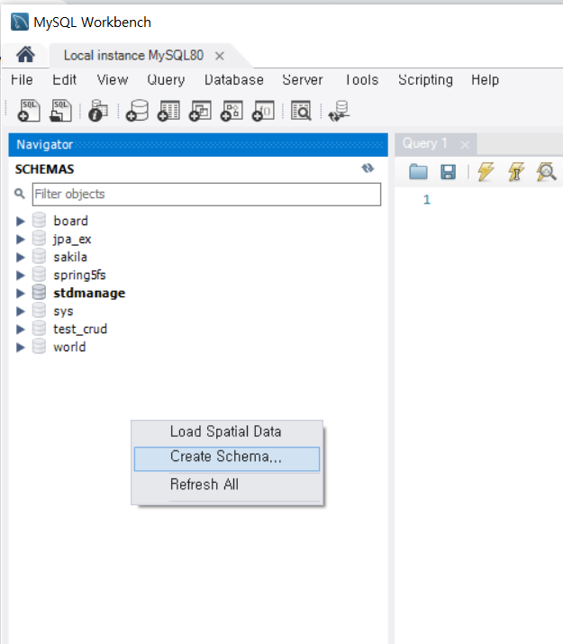 SCHEMAS 영역 마우스 오른쪽 버튼 클릭->Create Schema.. 클릭