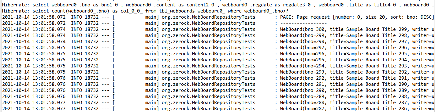 위의 테스트 결과와 같이 게시물번호(bno)를 기준으로 역순으로 출력된 것을 볼 수 있습니다.
