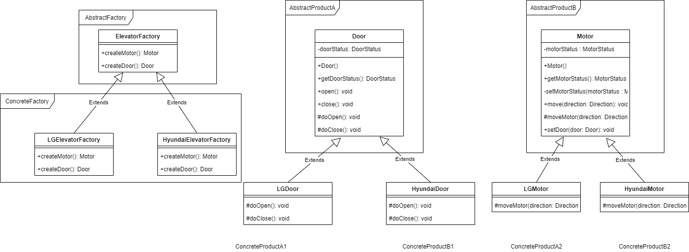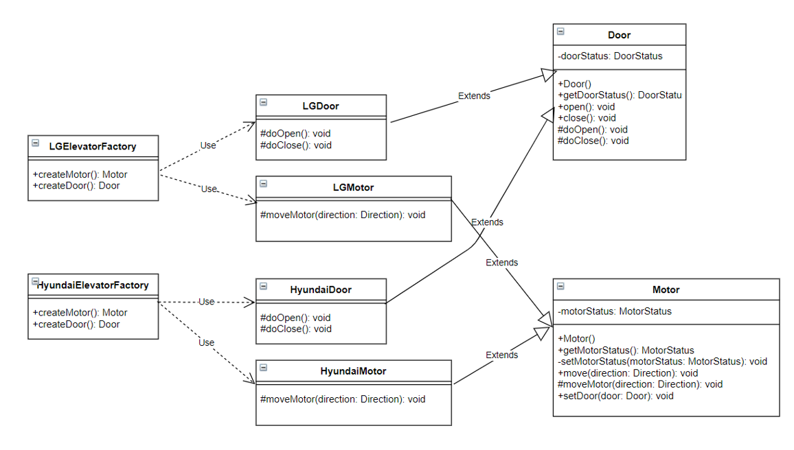 - HyundaiElevatorFactory : createMotor, createDoor 메소드를 통하여 HyundaiMotor, HyundaiDoor 객체 생성