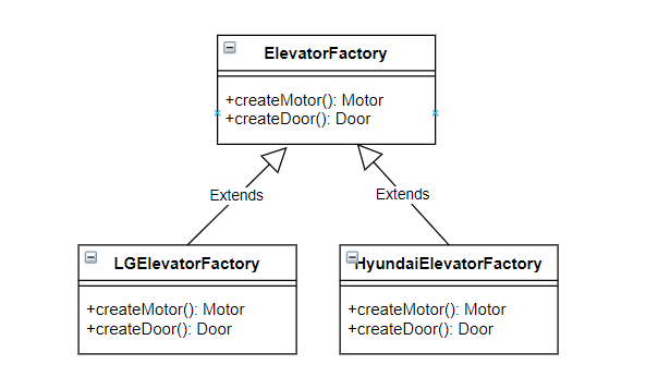 또한 엘리베이터 입장에서는 특정 제조 업체의 모터와 문을 제정하는 클래스가 필요하다. 에를 들면 LGMotor 객체와 LGDoor 객체가 필요하다. 이러한 경우 팩토리 메서드 패턴을 적용할 수 있다. 즉, MotorFactory 클래스를 정의해 LGMotor와 HyundaiMotor 중에서 특정 제조 업체에 따라 해당 Motor 객체를 생성할 수 있다.