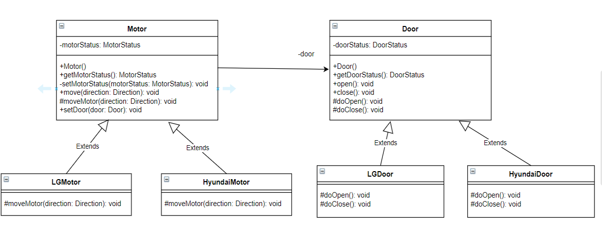 우선 LG의 모터와 현대 모터는 구체적인 제어 방식은 다르지만 엘리베이터 입장에서는 모터를 구동해 엘리베이터를 이동시킨다는 면에서는 동일하다. 그러므로 추상 클래스로 Motor 클래스를 정의하고 LGMotor와 HyundaiMotor를 하위 클래스로 정의할 수 있다. 마찬가지로 LGDoor와 HyundaiDoor를 Door 상위 클래스의 하위 클래스로 정의할 수 있다.