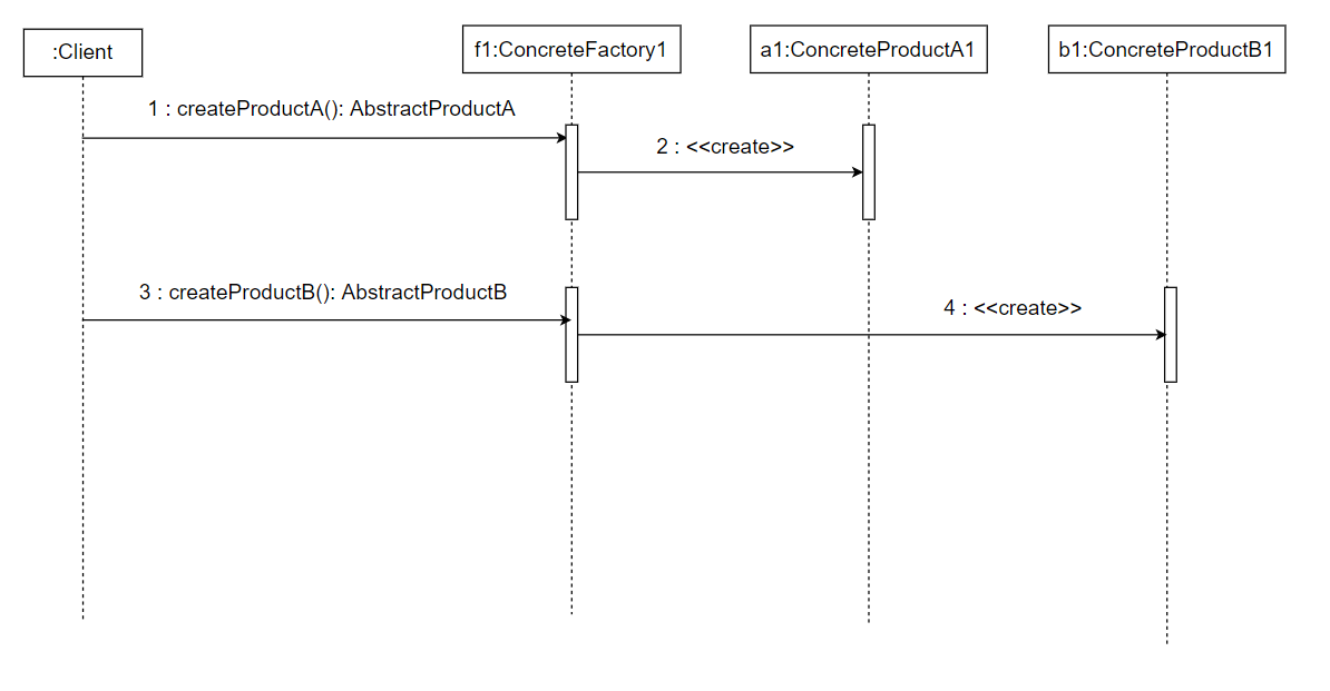 Clinet 클래스는 ConcreteFactory1 클래스의 createProductA 메소드를 호출함으로써 ConcreteProductA1 객체 a1을 생성한다.