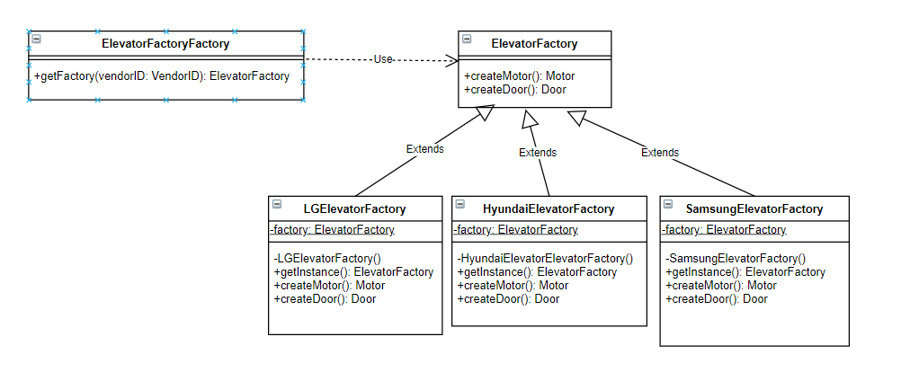 ElevatorFactoryFactory 클래스가 getFactory가 팩토리 메서드 역할을 한다. 그리고 각 제조 업체별 Factory 클래스는 싱글턴 패턴으로 설계한다.