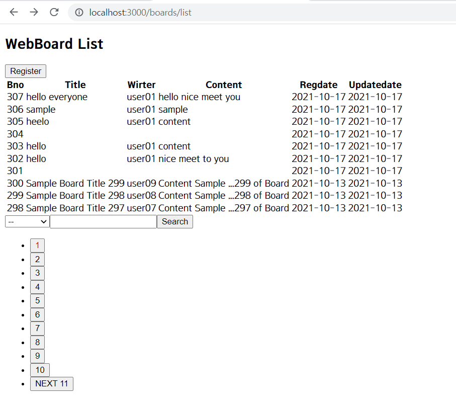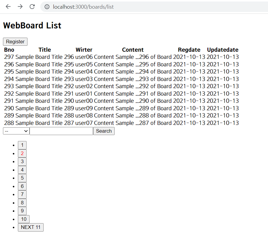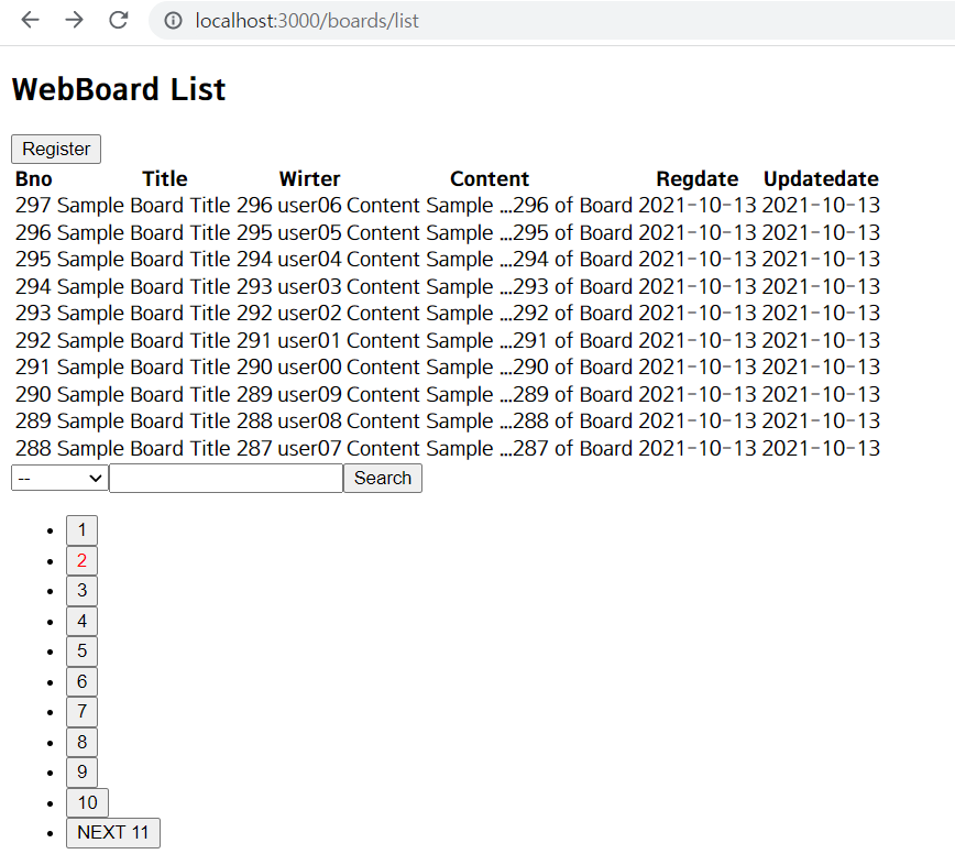 위 결과를 보면 새로고침을 수행시 2페이지 번호를 유지하는게 아닌 1페이지로 초기화된 것을 볼 수 있습니다. 이는 WebBoardListComponent.jsx 파일의 컴포넌트의 page 추출방식이 get 방식의 url 파라미터를 추출하는 것이 아닌 페이지 번호를 클릭하였을때 page 변수 변경시키고 그에 따른 게시물 리스트만 재 랜더링하는 방식이었습니다.