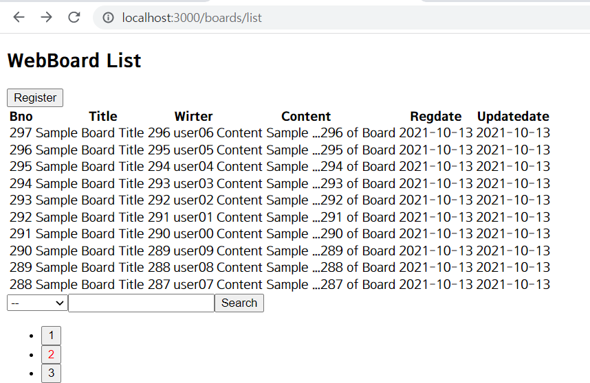 예를 들어 아래 그림은 게시물 리스트에서 2페이지 번호를 클릭하여 이동한 상태입니다. (before)