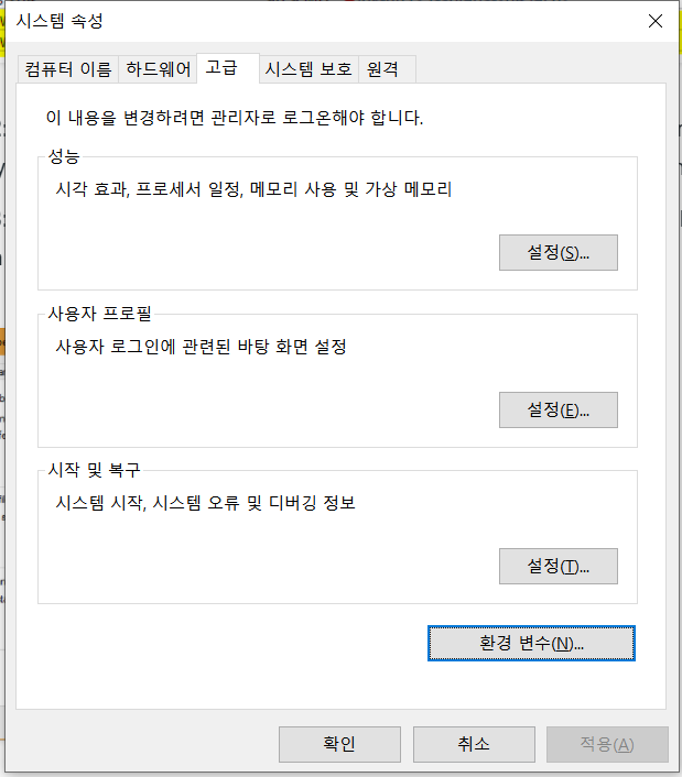 step3. 탐색기->시스템 환경 변수 검색-> 시스템 속성 창의 고급 탭 이동->환경 변수 클릭