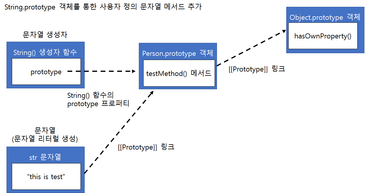 - Object.prototype, String.prototype, Number.prototype 등과 같이 표준 빌트인 프로토타입 객체에도 사용자가 직접 정의한 메서드들을 추가하는 것을 허용합니다.