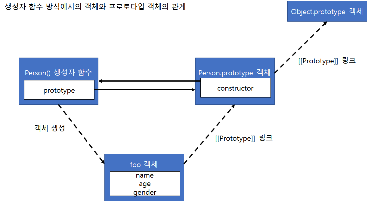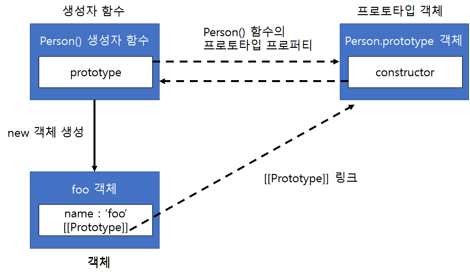 위 예제의 객체(foo), 생성자 함수(Person), 프로토타입 객체(Person.prototype)의 관계를 그림으로 표현하면 아래와 같습니다.