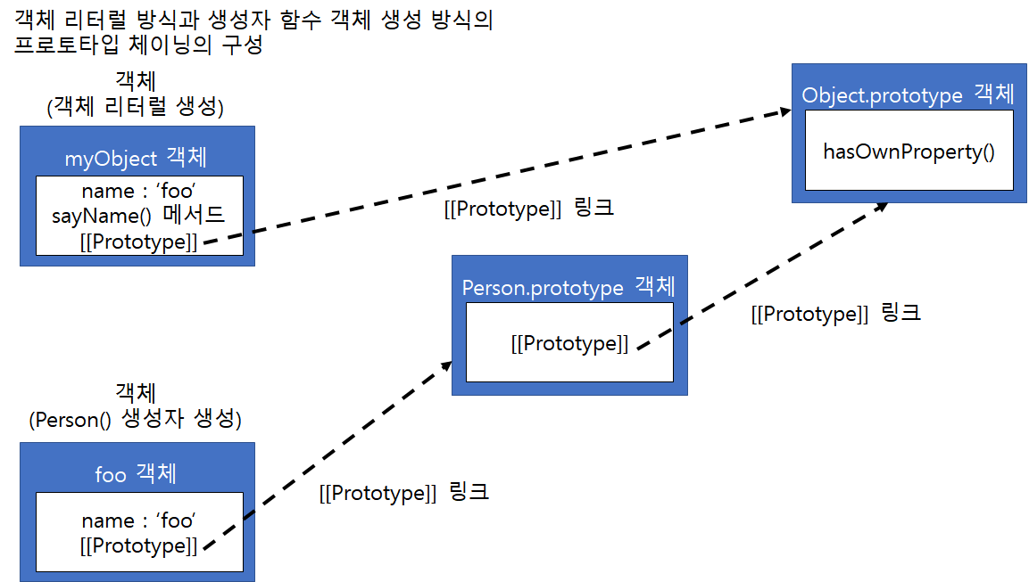 생성자 함수로 생성한 객체나 객체 리터럴 방식으로 생성한 객체는 약간 다른 프로토타입 체이닝으로 구성됩니다. 하지만 두가지 방식 모두 기본 원칙은 동일합니다.