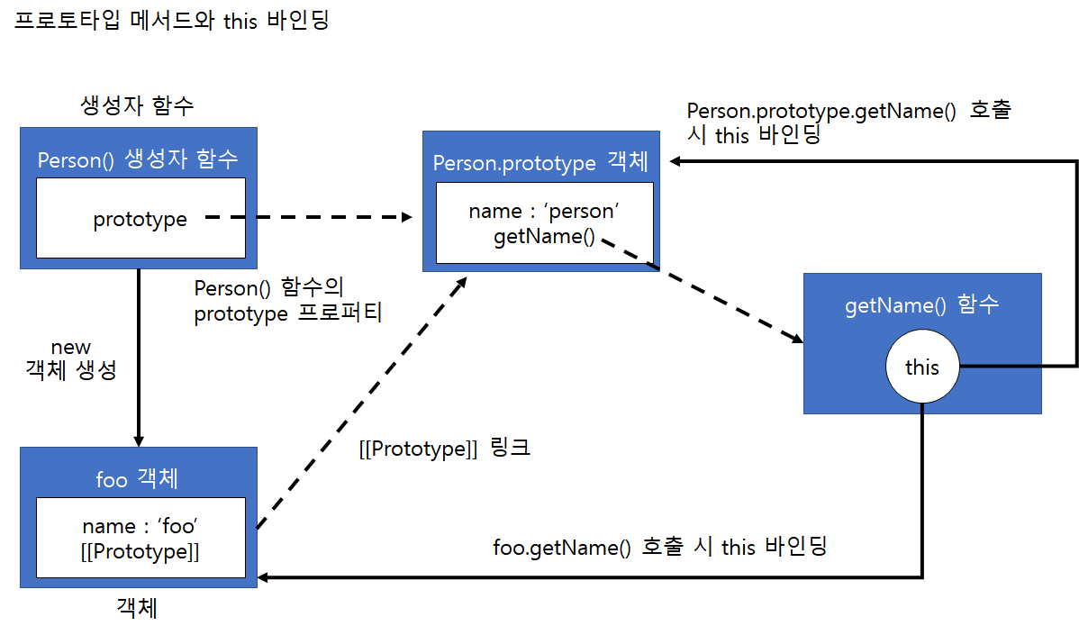 위 예제의 결과를 보면 foo.getName() 메서드 호출시 Person.prototype 프로토타입 객체의 getName() 메서드를 호출하지만 호출한 객체가 foo이기 때문에 this는 foo 객체를 가리킵니다. 그러나 Person.prototype.getName() 메서드 호출시에는 호출한 객체가 Person.prototype 프로토타입 객체이므로 this는 Person.prototype 객체를 가리키고 이 객체가 가지고 있는 name 프로퍼티 값(person)을 반환합니다. 위 예제의 과정을 그림으로 표현하면 아래와 같습니다.