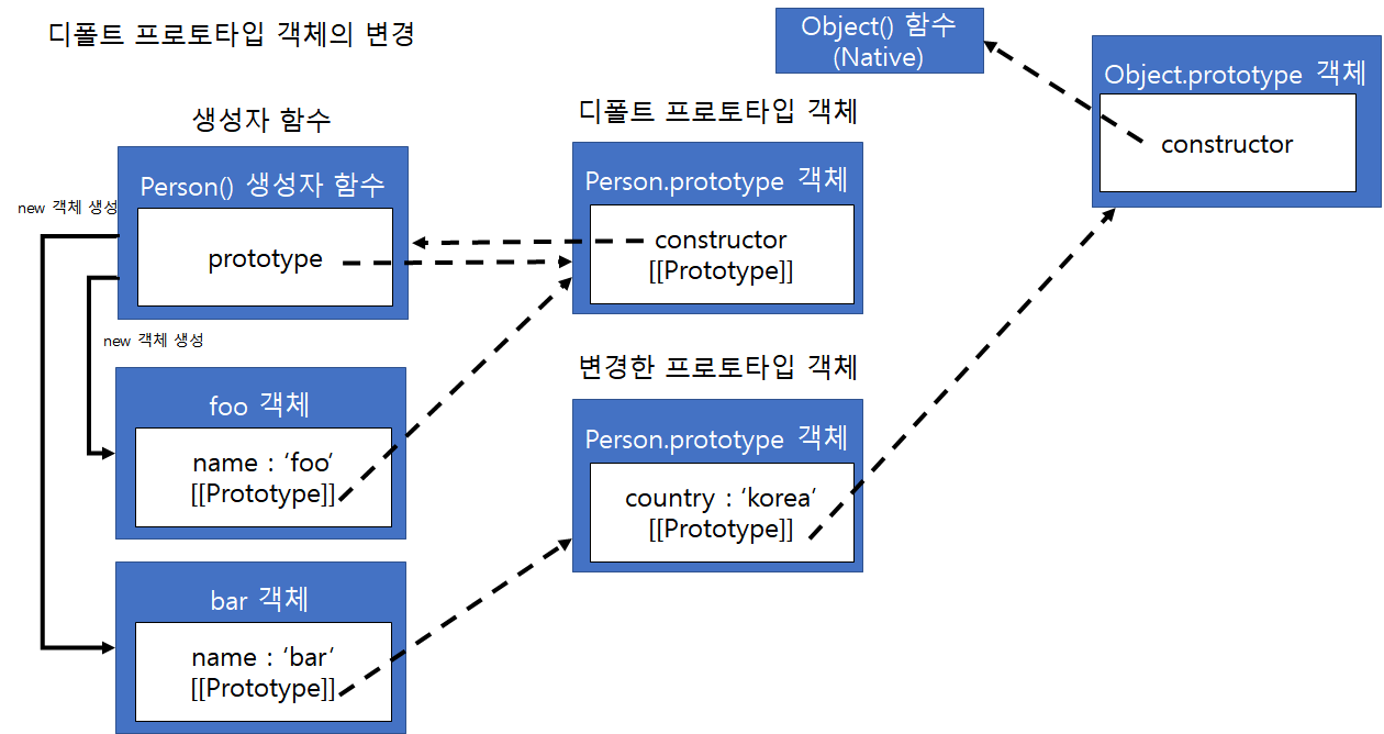 위 예제의 결과를 보면 Person.prototype 프로토타입의 객체를 변경한 이후의 foo 객체와 bar 객체의 country, constructor 프로퍼티를 참조하는 결과를 보면 foo 객체의 country 프로퍼티는 undefined를 반환하고 constructor는 Person() 생성자 함수를 가리키는 것을 볼 수 있습니다. 반면 Person.prototype 프로토타입 객체를 변경한 이후 생성된 객체인 bar 객체는 country 프로퍼티를 참조할 수 있고 constructor 프로퍼티는 객체 리터럴 방식의 생성자 함수의 프로토타입 객체인 Object.prototype 객체를 가리키는 것을 볼 수 있습니다. 위의 예제의 객체 관계를 그림으로 표현하면 아래와 같습니다.