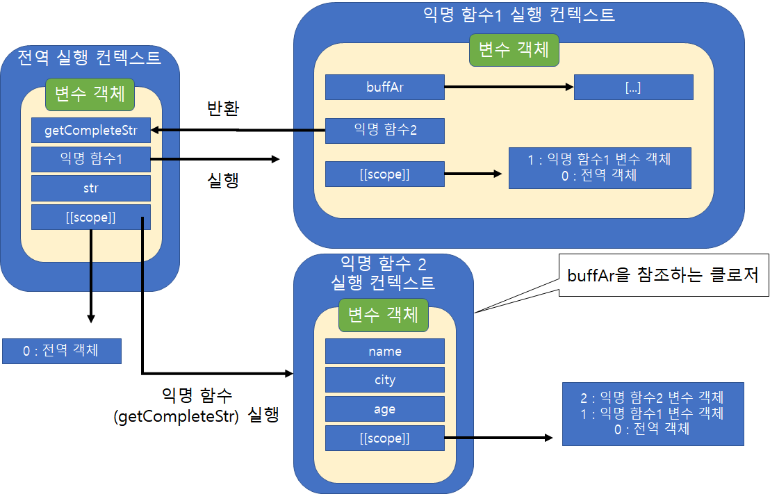 위 코드에서 주목할점은 getCompleteStr에 익명의 함수를 즉시 실행시켜 반환되는 함수를 할당하는 것입니다. 이 반환되는 함수가 클로저가 되고, 이 클로저는 자유 변수 buffAr을 스코프 체인에서 참조할 수 있습니다. 클로저에 있는 스코프 체인을 그려보면 아래와 같습니다.