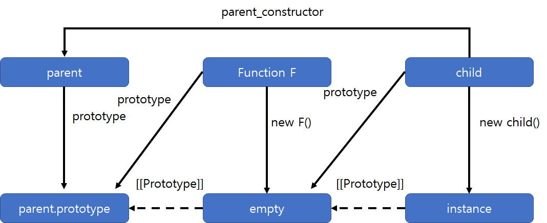 자식 클래스는 child라는 이름의 함수 객체를 생성함으로써 만들어졌습니다. 부모 클래스를 가리키는 parent는 this를 그대로 가리킵니다. 위 예제의 관계를 그림으로 표현하면 아래와 같습니다.