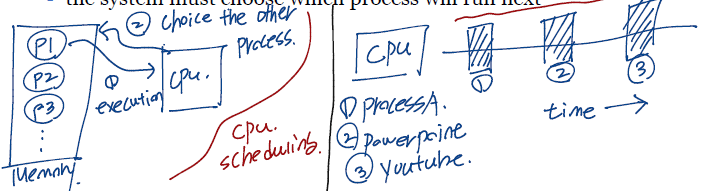 CPU가 여러개의 프로그램들을 빠르게 교체하기 위해서 프로그램의 실행 순서를 결정하는 CPU 스케줄링을 수행합니다. CPU 스케줄링이란 만약 여러개의 프로세스들이 같은 시간에 실행될 준비가 되었다면 운영체제는 다음에 실행될 프로그램을 결정해야 합니다. 즉, 운영체제가 다음에 CPU의 의해 실행될 프로그램을 고르는 것을 CPU 스케줄링이라고 합니다.