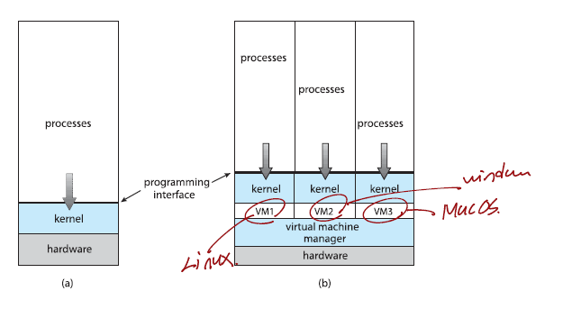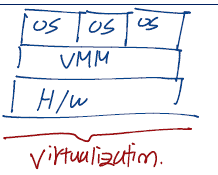 위의 그림에서 (a)는 하나의 운영체제를 올린 것이고 (b)는 하드웨어에 VMM을 통하여 여러개의 운영체제를 수행시키는 모습니다.