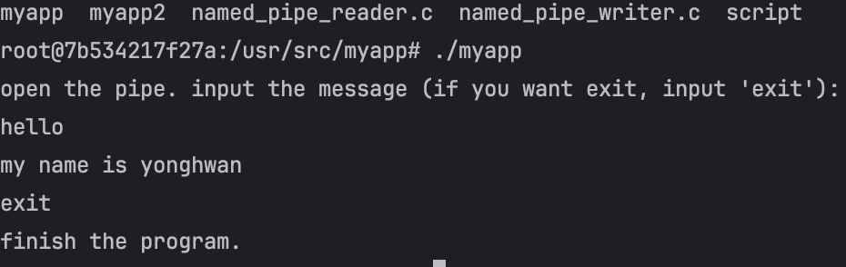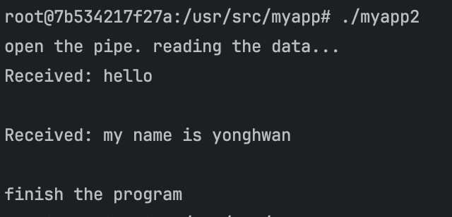 반대로 myapp2 프로세스는 파이프로부터 데이터를 읽은 다음에 출력하는 것을 볼 수 있습니다.