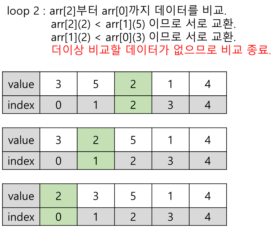 - 만약 기준이 되는 데이터값이 이전 위치에 존재하는 데이터값보다 작다면 값을 서로 교환합니다. 그러나 값이 크다면 비교를 종료합니다.