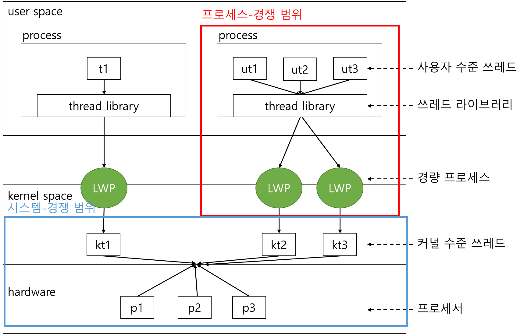 프로세스-경쟁 범위와 시스템-경쟁 범위를 그림으로 표현하면 다음과 같습니다.