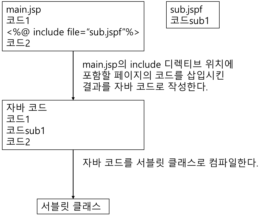 - include 디렉티브(<%@ include file="포함할 파일"%>)는 다른 파일의 내용을 현재 위치에 삽입 시킨 후에 JSP 파일을 자바 파일로 변환하고 컴파일하는 방식