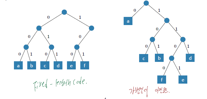 - Prefix code는 하나의 이진트리로 표현이 가능합니다.