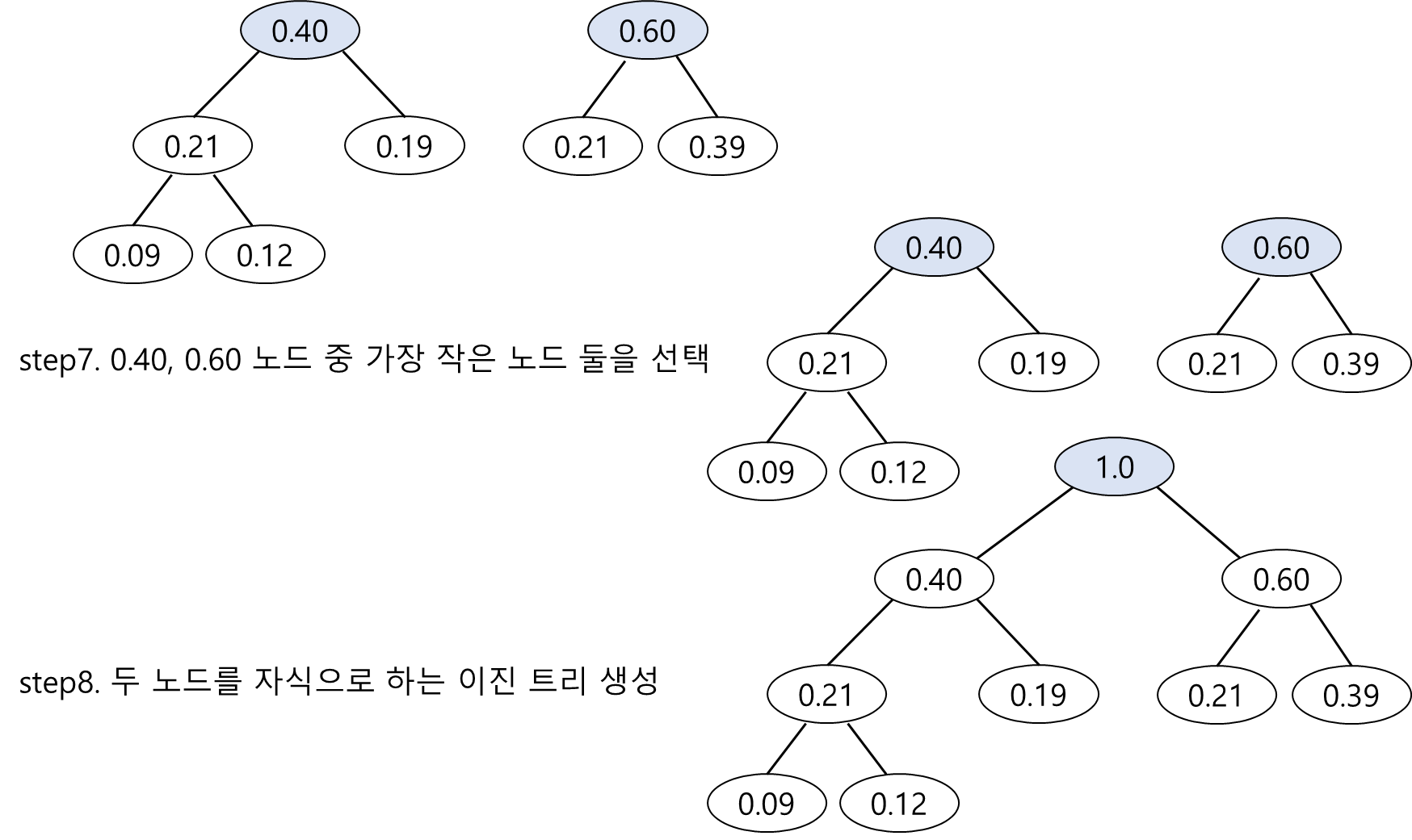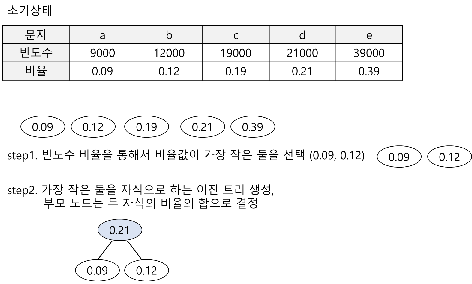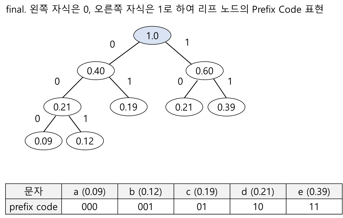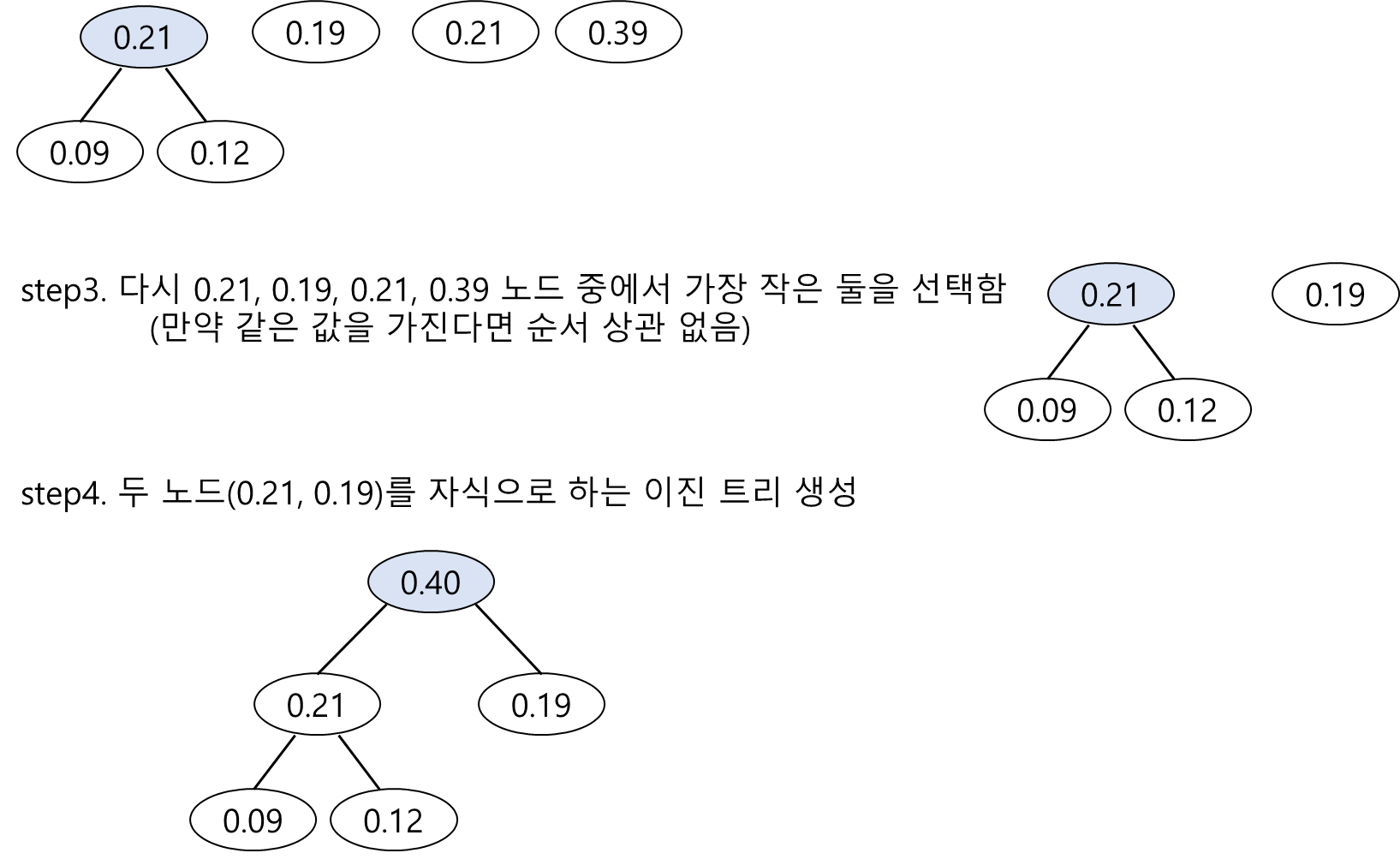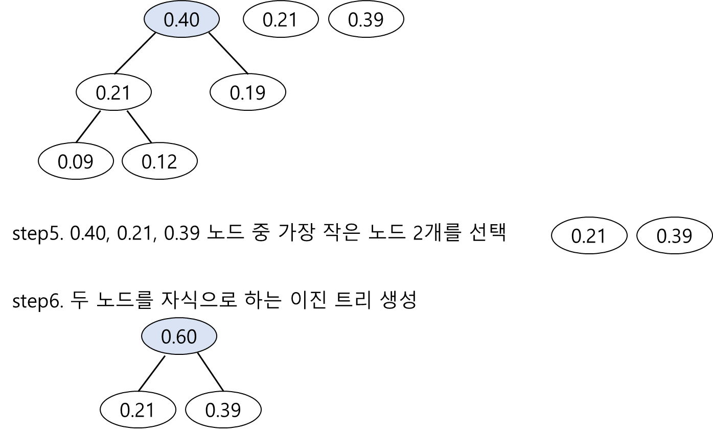 - 가장 작은 둘을 자식 노드로 하는 이진 트리 생성, 부모 노드의 값은 두 노드의 비율의 합으로 저장됨