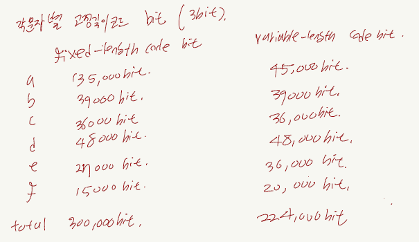 - a=1bit, b=3bit, ..., f=4bit로 대응하여 비트 수를 세면 224,000 bit가 됩니다.