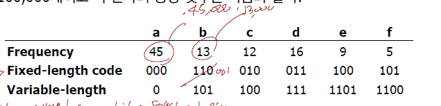 - 예를 들어 위의 표에서는 a=0, b=101, c=100, d=111, e=1101, f=1100을 의미합니다.