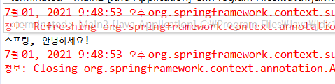 - AnnotationConfigApplicationContext 클래스 : 자바 설정에서 정보를 읽어와 빈(Bean) 객체를 생성하고 관리한다.