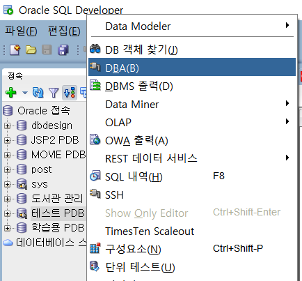 3.1 SQLDeveloper -> 테스트 PDB 서버 클릭 -> 상단의 탭의 보기 -> DBA 클릭
