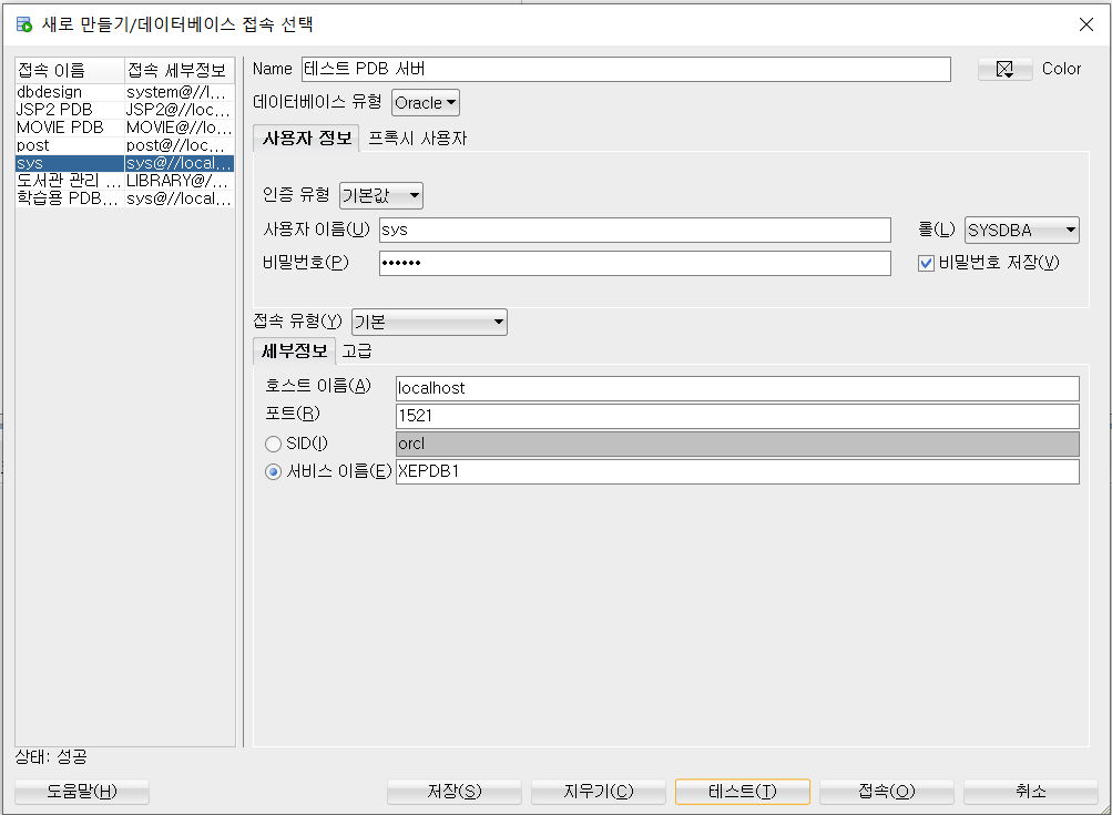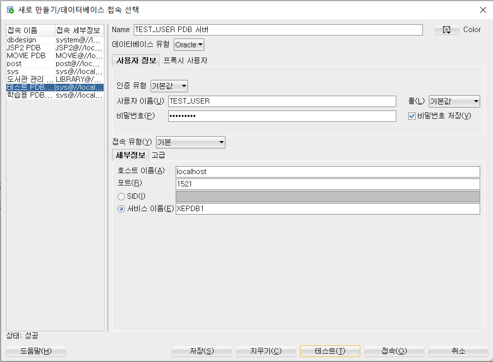 데이터베이스 이름은 "테스트 PDB 서버", PDB 서버 이름은 "XEPDB1"으로 설정