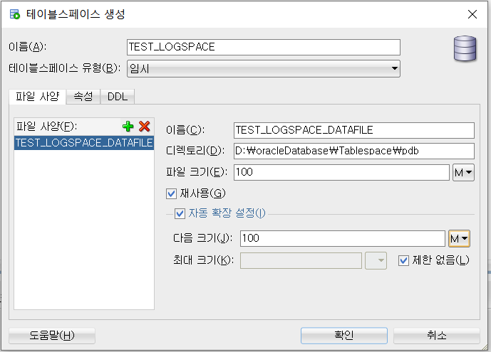3.5 이번에는 로그 스페이스를 생성합니다. 이전 단계와 똑같이 테이블 스페이스 생성창으로 이동한 다음 다음과 같이 입력합니다. 테이블 스페이스 유형이 임시라는 것에 주목합니다.