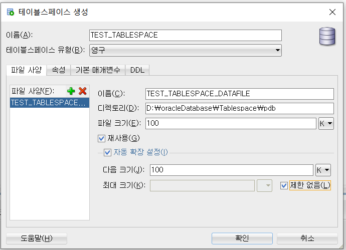 3.3 테스트 PDB 서버 -> 저장영역 -> 테이블 스페이스 오른쪽 버튼 클릭 -> 새로 만들기