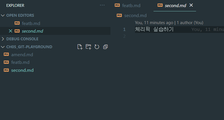1.7 1.6단계를 마친 상황에서 [feat/b] 브랜치가 [feat/a] 브랜치의 '두번째 커밋 : 체리픽 실습하기' 커밋만을 가져와서 [feat/b] 브랜치에 반영하고자 합니다. [feat/a] 브랜치와 그냥 병합하면 'first.md 파일 추가' 커밋과 'third.md 파일 생성' 커밋도 같이 반영이 되므로 이 상황은 피하고 싶습니다. 이러한 상황에서 체리픽 기능을 사용합니다.
