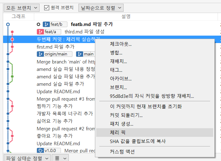 1.8 [feat/b] 브랜치 상태에서 체리픽을 원하는 커밋을 선택 -> 마우스 오른쪽 버튼 클릭 -> 체리픽 클릭 -> 확인 클릭