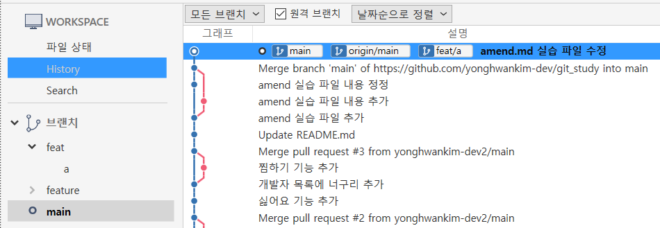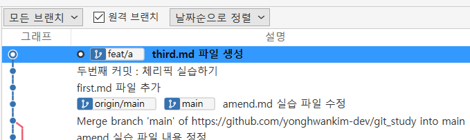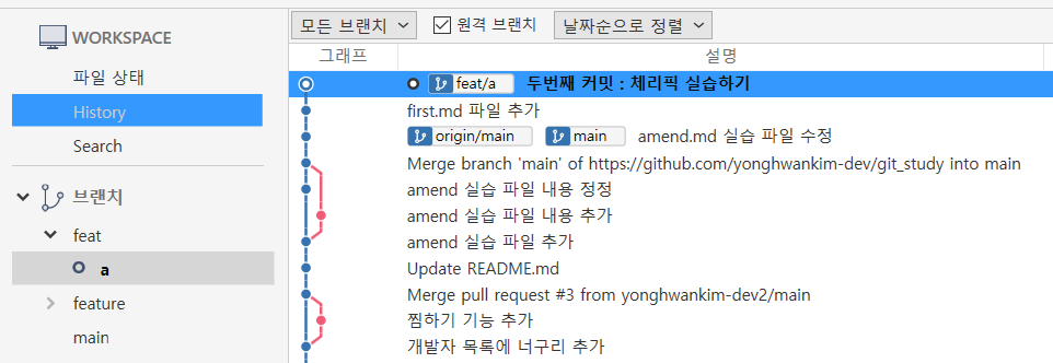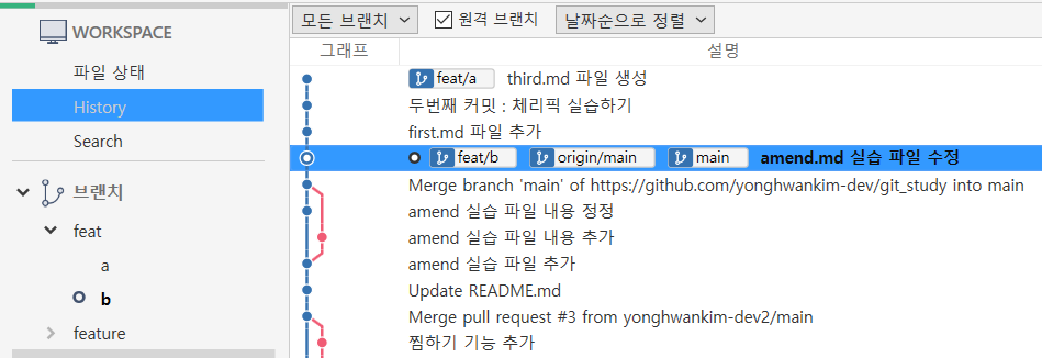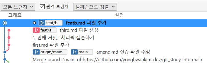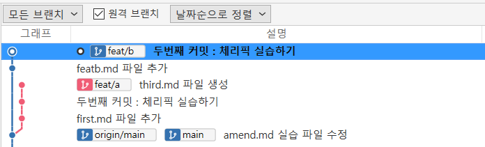 위 결과를 보면 [feat/b] 브랜치에 체피릭 실습하기 커밋이 반영된 것을 볼 수 있습니다.