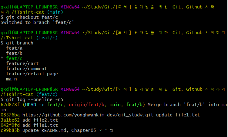 (feat/c) $ git log --oneline -n5 # 변경된 브랜치 확인