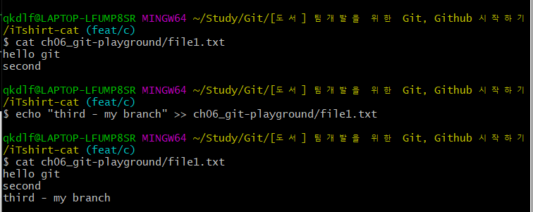 (feat/c) $ echo "third - my branch" >> ch06_git-playground/file1.txt # 파일에 내용 추가