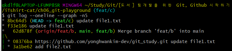 (feat/c) ch06_git-playground $ git log --oneline --graph -n5 # 커밋 로그 보기
