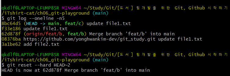 $ git reset --hard HEAD~2 # 브랜치 되돌리기