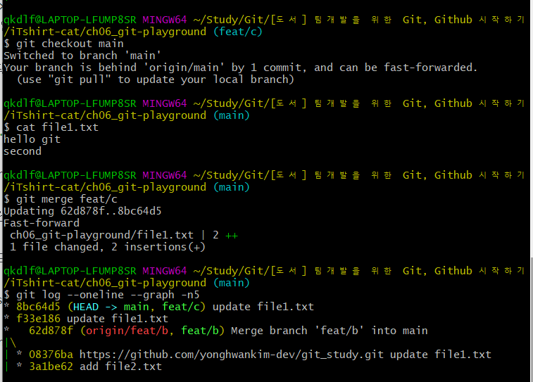 (main) ch06_git-playground $ git merge feat/c # 병합, fast-forward